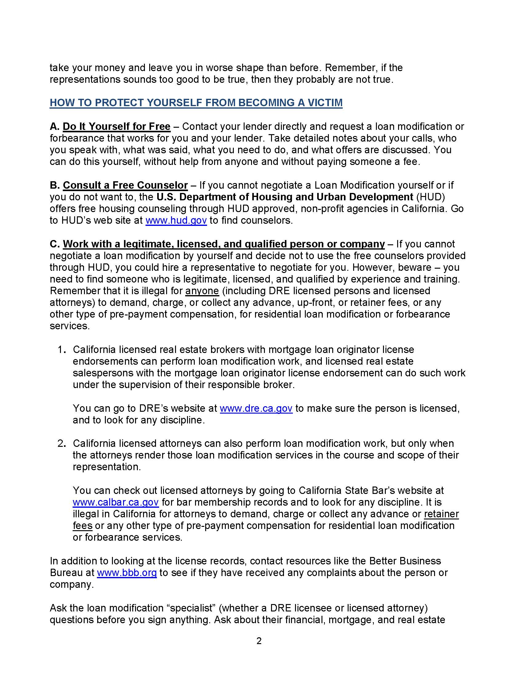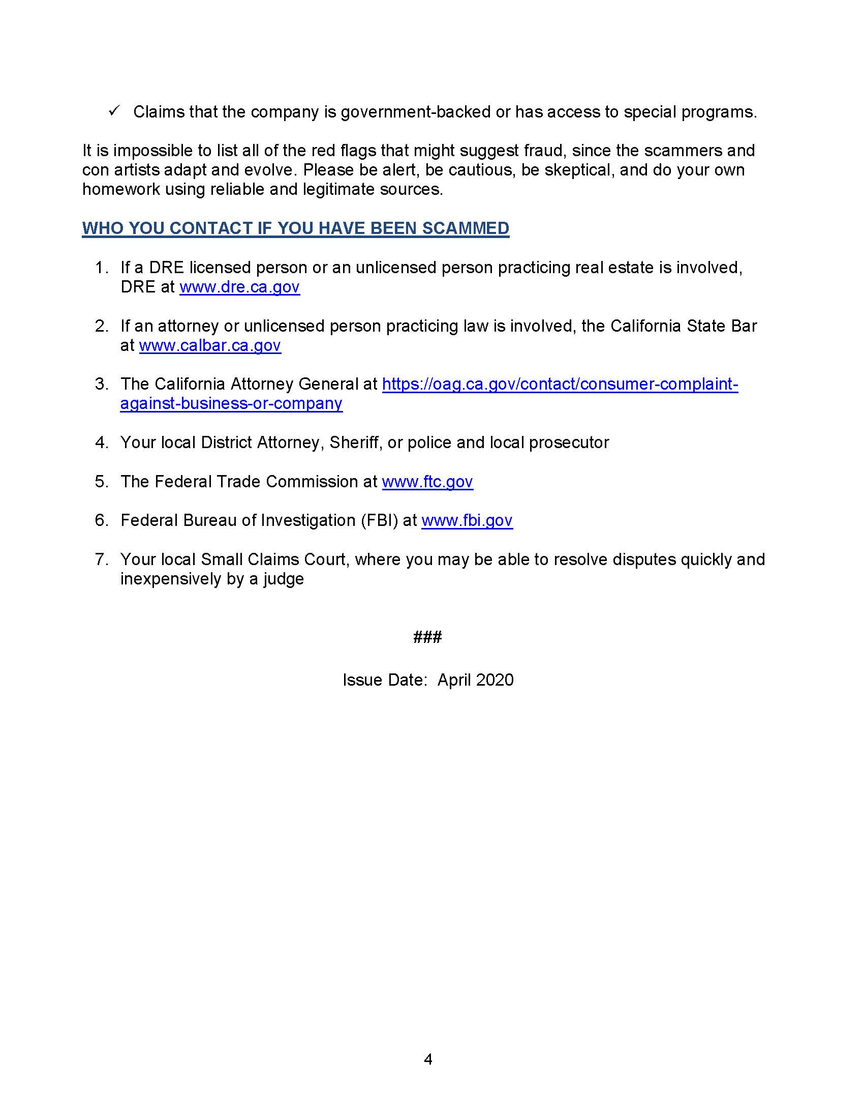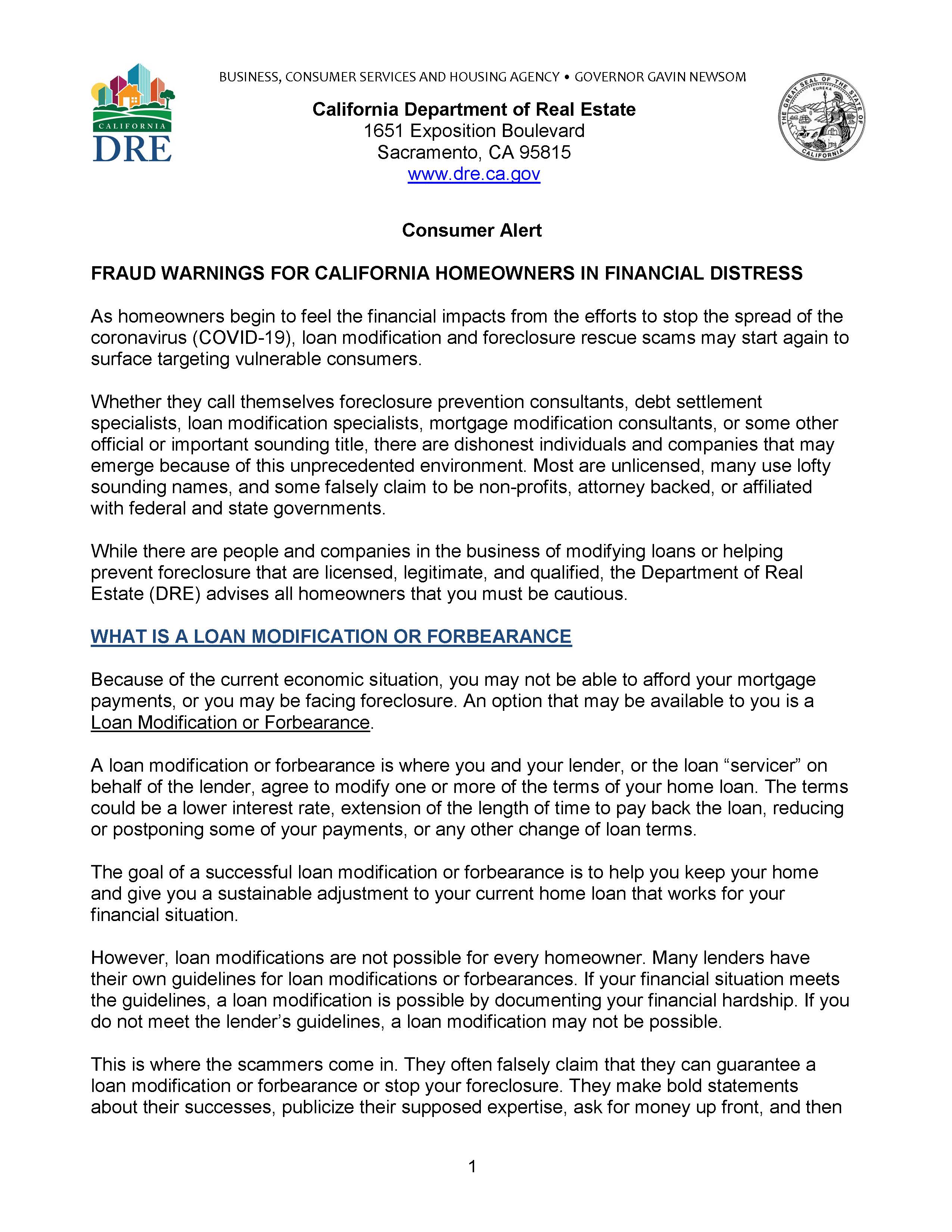 SACRAMENTO – The California Department of Real Estate (DRE) is warning California consumers that the COVID-19 pandemic may lead to an increase in loan modification scams and foreclosure rescue scams, as previously seen during the mortgage meltdown of the late 2000s. DRE issued a Consumer Alert which explains loan modifications and loan forbearances, who can perform them, how to spot scammers by identifying red flags, and where to get help. Consumers can research whether or not a company or individual is licensed to perform mortgage assistance by visiting DRE’s website at DRE.