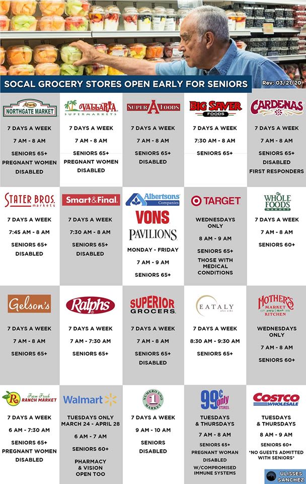 Angelenos 65 and older now have access to purchase groceries at designated times with participating stores to ensure everyone is safe during this crisis. Below is a handy chart, and additional information can be found in the LA Times.