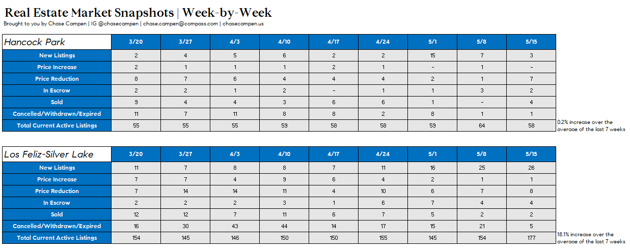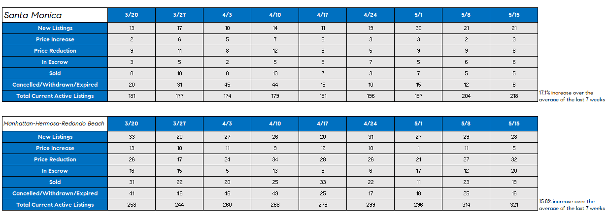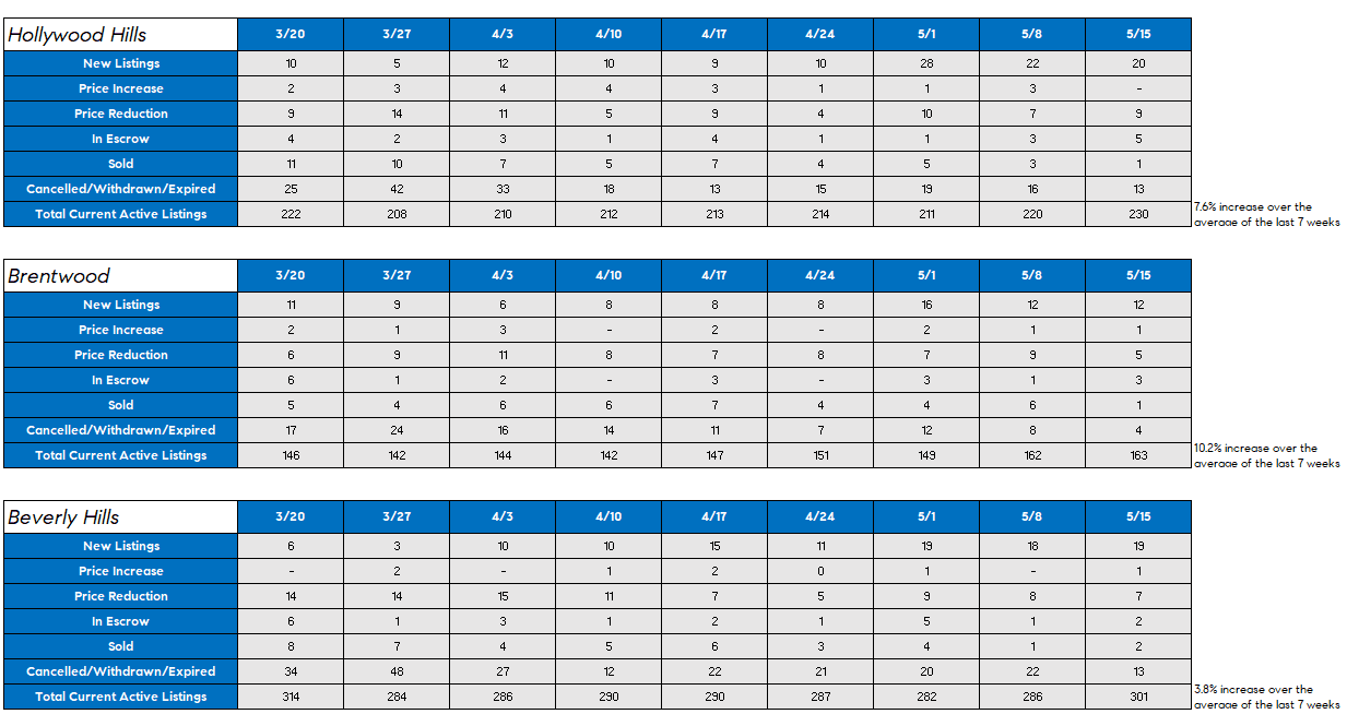 Every Friday, we bring you this Los Angeles Real Estate market snapshot. This week, we see a significant increase in the number of total listings available on the market in many neighborhoods. Los Feliz and Silver Lake combined are seeing an 18.1% increase in inventory, 10.2% in Brentwood, 17.1% in Santa Monica, and 15.8% in the South Bay neighborhoods of Manhattan, Hermosa and Redondo Beach.