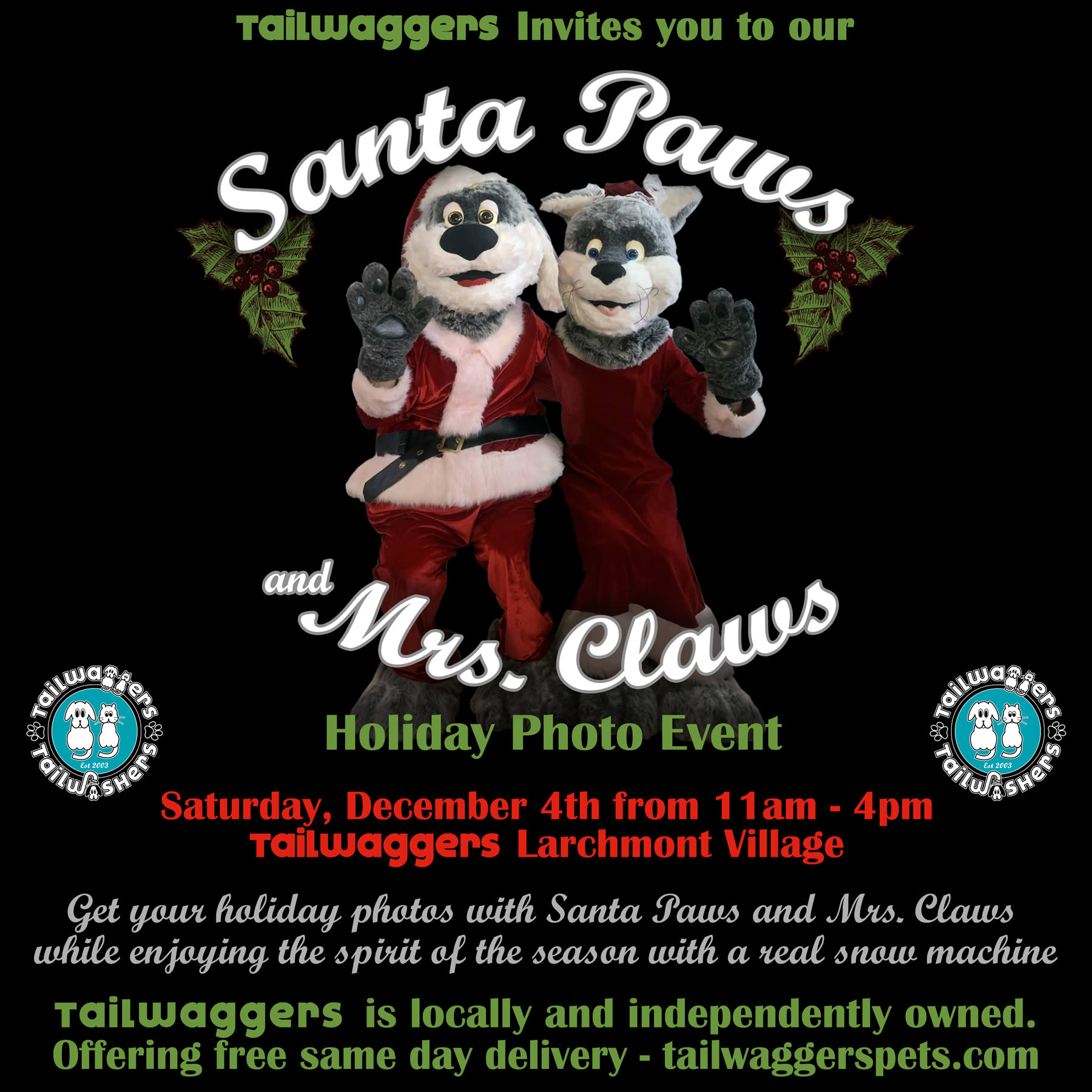We are also doing a Santa Paws and Mrs. Claws event. Saturday, December 4th at 11 am to 4 pm at Tailwaggers Larchmont village. We are also bringing in 10 tons of snow for the pups to play in for this event!